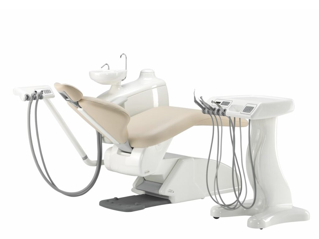 – Der pantografische Assistentenarm ist äußerst komfortabel; mit zwei Absaugschläuchen und einem freien Platz ermöglicht er der Assistenz die bequeme Handhabung von Instrumenten, Handstücken, Behandlungsstuhl und Absaugung.