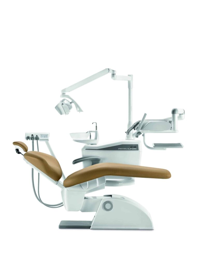 Der Patavium wurde erneuert – die beliebteste Behandlungseinheit von OMS. Bei der Entwicklung wurde der Ergonomie besondere Aufmerksamkeit gewidmet: Der Instrumententisch in S.P.R.I.D.O.-Bauweise ermöglicht während der Arbeit eine nahezu horizontale Bewegung der am Gerät befindlichen Handstücke. Dadurch stößt der Arm nicht an die OP-Leuchte und – was in der Praxis am wichtigsten ist – „zieht die Einheit die Hand während der Arbeit nicht zurück“. Die kompakten Behandlungsstühle sind so konzipiert, dass der Behandler während der Behandlung möglichst nah am Patienten sitzen kann. So ist ein Arbeiten in perfekt ergonomischer Position möglich, wobei Wirbelsäule, Lendenbereich und Beine geschont werden. Der Wasserblock ist um 45 Grad schwenkbar, sodass auch die Assistenz in unmittelbarer Nähe des Patienten arbeiten kann.